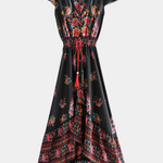 Vibrant, free-spirited, and full of character. The Chiara dress evokes a bohemian spirit with its multicoloured floral pattern on a black background and flowing details. The flared sleeves, adjustable waist, and asymmetrical skirt create a silhouette that moves with you and effortlessly highlights your essence.