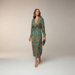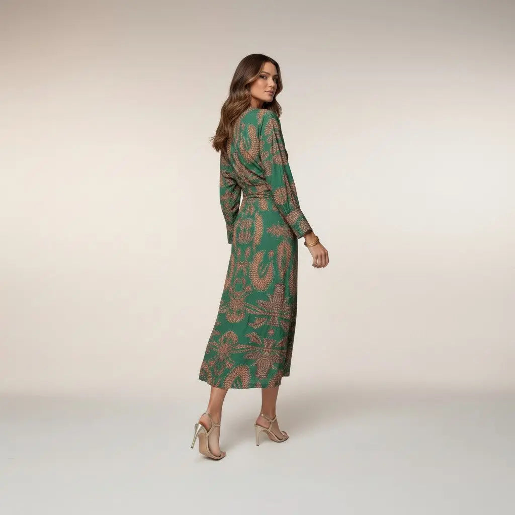 • Elegant midi dress in green with sophisticated gold print, ideal for special occasions